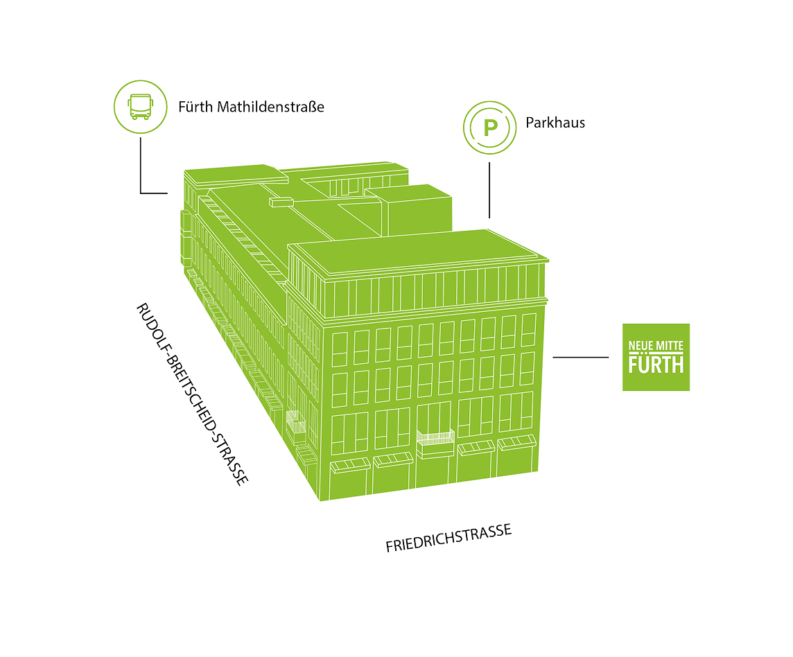 Das Shoppingcenter Neue Mitte Fürth bietet zentrales und komfortables Parken in der hauseigenen Tiefgarage. Die Einfahrt befindet sich in der Moststraße 14. Von dort gelangen Sie schnell und barrierefrei direkt ins Einkaufszentrum – ideal für stressfreies Shopping in der Innenstadt.